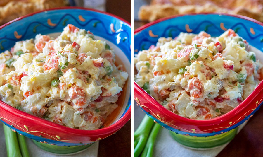 Η περουβιανή εκδοχή της ensalada Rusa, για παράδειγμα, είναι συνήθως αρκετά απλή με πατάτες, καρότα και μπιζέλια, αλλά έχει επίσης ένα έντονο χρώμα από τα παντζάρια. Η περσική σαλάτα Olivieh περιλαμβάνει αυγά, αγγούρια τουρσί, καρότα και αρακά.