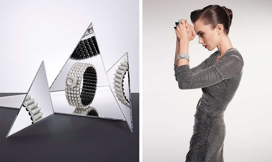 Καλλιεργώντας περαιτέρω αντιθέσεις με τον όγκο, το νέο δαχτυλίδι XL, βραχιόλι, κολιέ και σκουλαρίκια βλέπουν το χαρακτηριστικό picot stud της συλλογής να βρίσκει το είδωλό του στον καθρέφτη σε μια διαχωριστική γραμμή από διαμάντια.