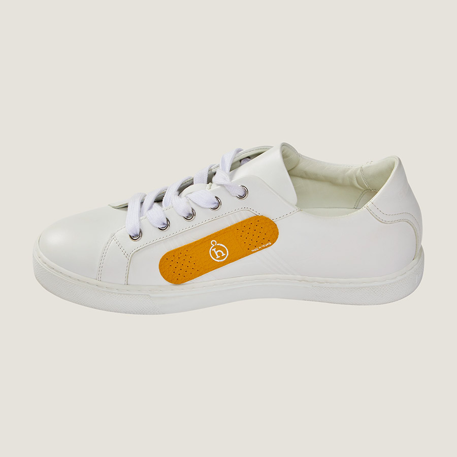 Επιλεγμένο για την απαλότητα και την ευκαμψία του, το δέρμα αρνιού χρησιμοποιεί στοιχεία από τα κλασικά επιθέματα τραυμάτων: Το δέρμα είναι διάτρητο στα άκρα και δύο γλωττίδες προστατεύουν την κόλλα πριν από την εφαρμογή.