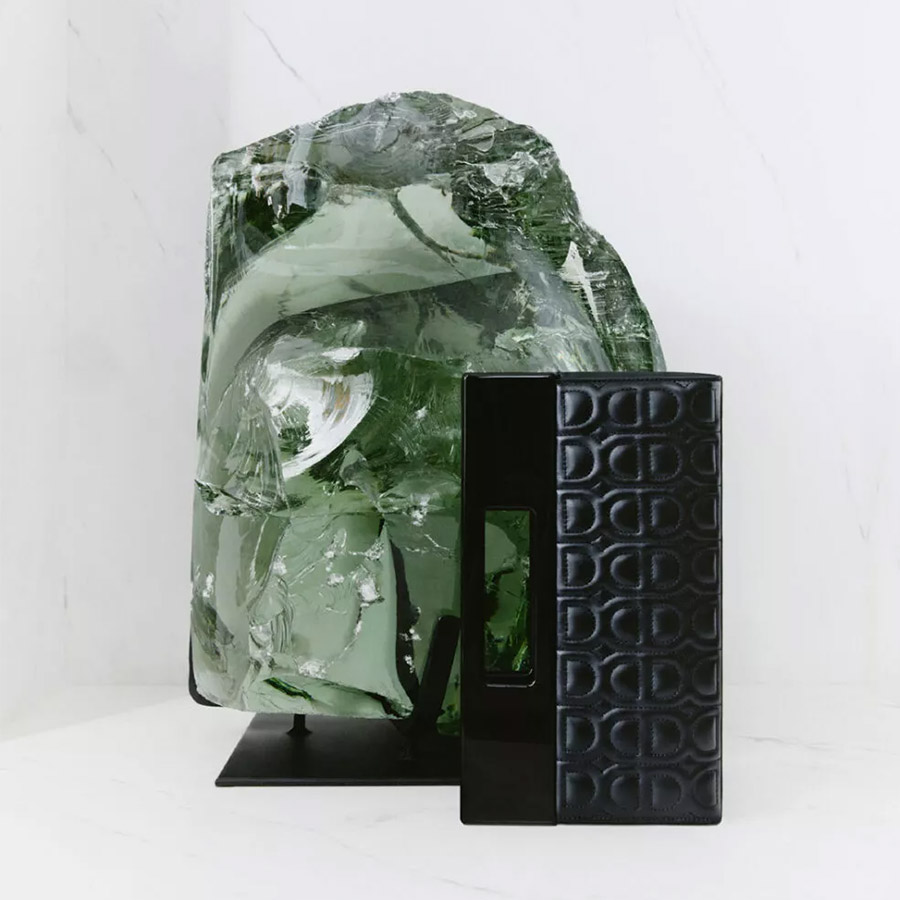 Ένα γυαλιστερό plexiglass χερούλι, στιβαρό και αρχιτεκτονικό, συνδυάζεται με ένα απαλό, καπιτονέ σώμα από nappa δέρμα, όπου το μονόγραμμα του ξενοδοχείου THE DOLLI αποτυπώνεται ως ανάγλυφο γεωμετρικό μοτίβο, εμπνευσμένο από τη νεοκλασική πρόσοψη και τα ασπρόμαυρα μαρμάρινα δάπεδα του ξενοδοχείου.
