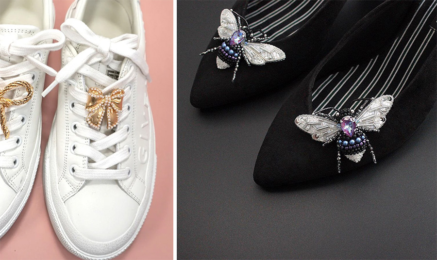 - Σε παπούτσια: Προσθέστε μια καρφίτσα στα αθλητικά σας παπούτσια ή στις γόβες σας για μια παιχνιδιάρικη και λαμπερή λεπτομέρεια.