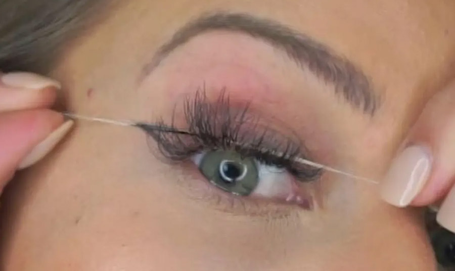 Τι κάνουμε; Χρειαζόμαστε ένα υγρό άι-λάινερ στην αγαπημένη μας απόχρωση. Κόβουμε ένα κομμάτι οδοντικού νήματος και το βάφουμε με το υγρό χρώμα. Τώρα, θα το ακουμπήσουμε διαγώνια από την εσωτερική προς την εξωτερική γωνία των ματιών μας δύο φορές, ώστε να δημιουργήσουμε την επάνω και την κάτω γραμμή.