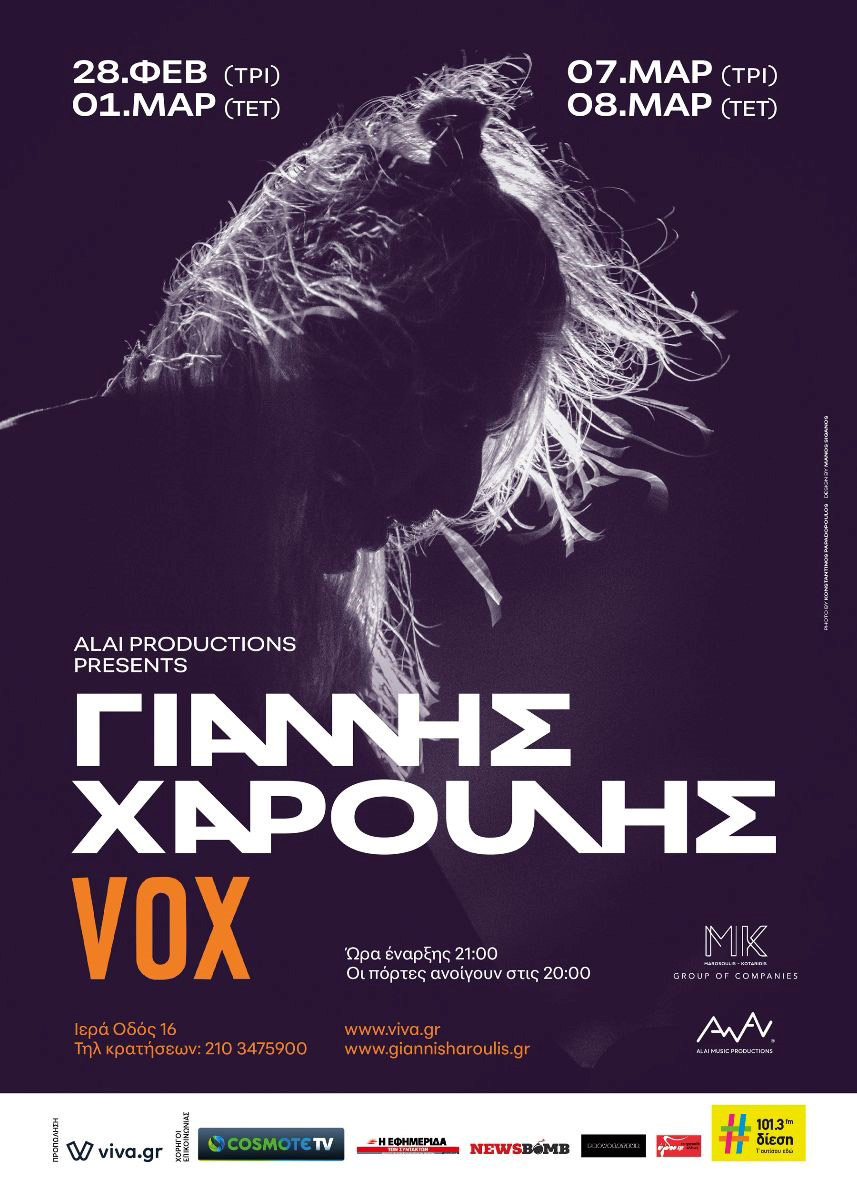Ο Γιάννης Χαρούλης και οι μουσικοί του, μετά από ένα δυνατό συναυλιακό καλοκαίρι με σταθμούς σε όλη την Ελλάδα και μια ξεχωριστή συναυλία στο Λονδίνο, ετοιμάζονται για τέσσερις μοναδικές εμφανίσεις στο VOX.