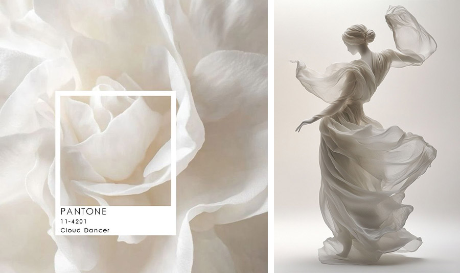 Περιγραφόμενο ως «ένα κυματιστό, ισορροπημένο λευκό διαποτισμένο με μια αίσθηση γαλήνης», το Cloud Dancer διαβάζεται λιγότερο σαν απουσία και περισσότερο σαν μια αναπνεύσιμη σκηνή που αναδεικνύει την υφή, τη σκιά και την τέχνη.